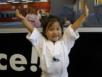 At first, Elizabeth would grace the Karate floor with ballet moves in her uniform, but quickly acclimated and is now is a force to be reckoned with in a dark alley :) ... In all seriousness, they are teaching the children self defense, and safety along with the usual Karate skills. If a child doesn't respond correctly during the class drill, that child will be drilled over and over during class until they 'understand' and get it correct.